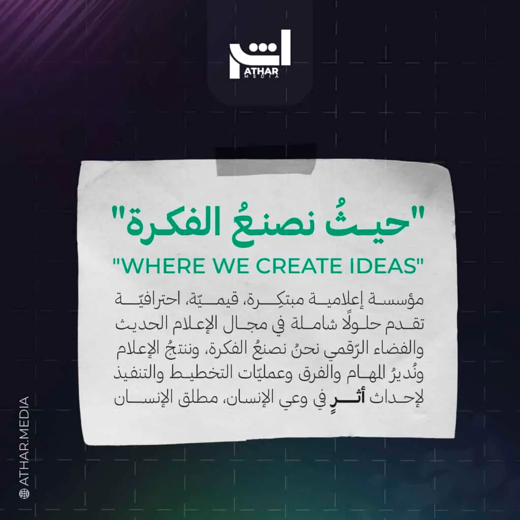 أثر ميديا مؤسسة إعلاميّة هادف ، تنتج الأفكار وتدعم القيم، وتنشئ حملات الرأي العام والترويج عبر الإعلام الرّقمي؛ لتدعم كل ما هو مثمر ومبتكر.